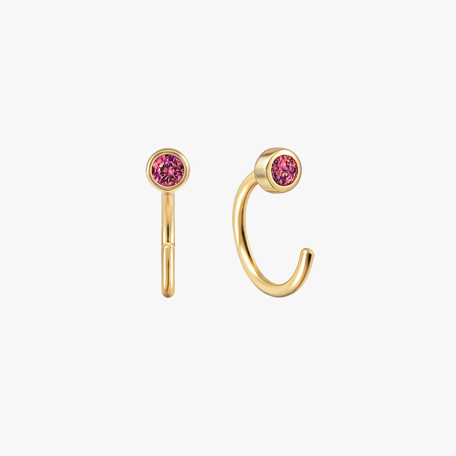 Vendbare bitte små mini rubin bezel huggie øreringe, der tilføjer et strejf af farve og lyser dit look op. Velegnet til brusk, 2. og 3. piercing! En nem og alsidig ørering at tage på, hægte og gå!