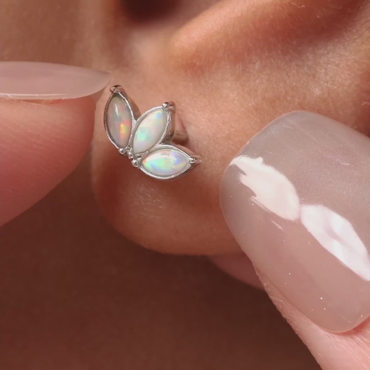 Abraza la elegancia con el pendiente Opal Trio Marquise Flatback. Presentando tres ópalos radiantes con corte marquesa dispuestos en un diseño de abanico, este pendiente flatback con rosca combina comodidad con un brillo suave e iridiscente, perfecto para añadir un toque de magia de ópalo a cualquier conjunto de pendientes.